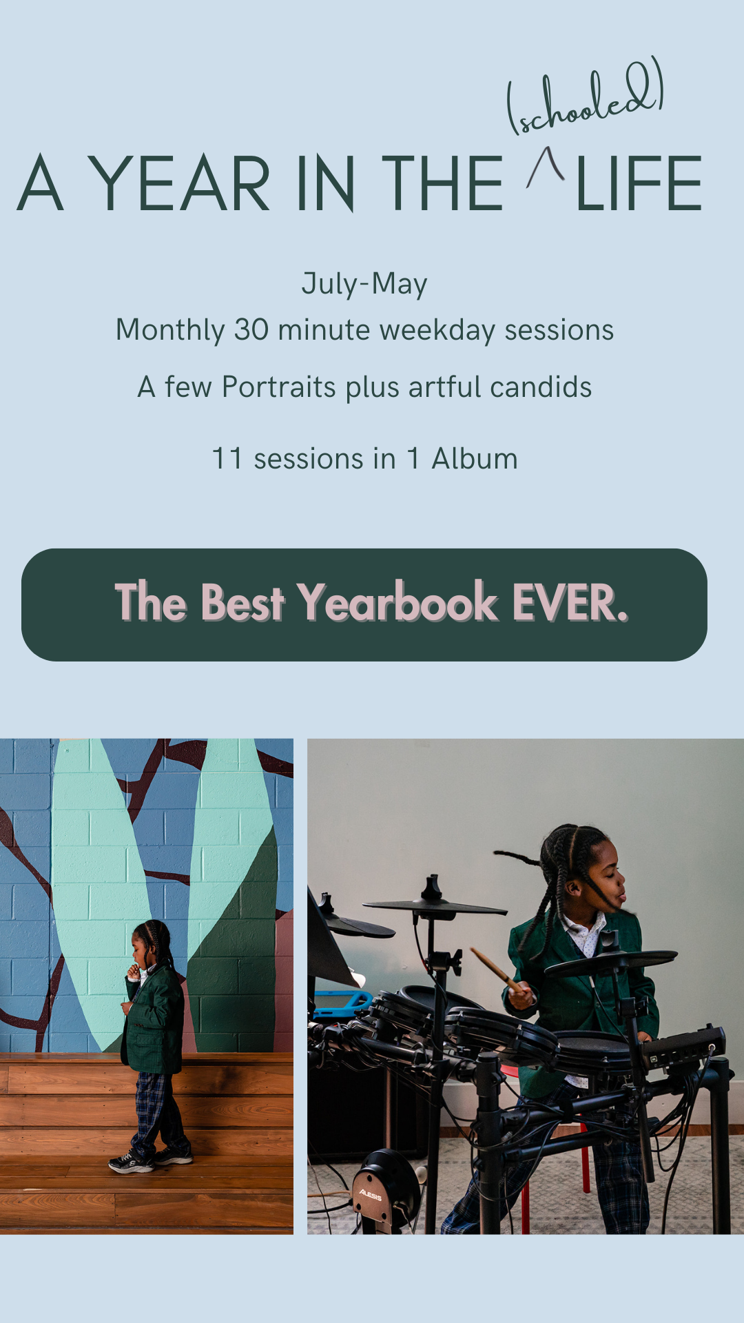 Inspired by my Year in the Life project, in which I have regular documentary family photo sessions throughout the calendar year and then deliver the year's highlights in an album, this project will follow and document just one child throughout the school year. Of course the rest of the family will be around and included some, but these sessions will focus on one child.